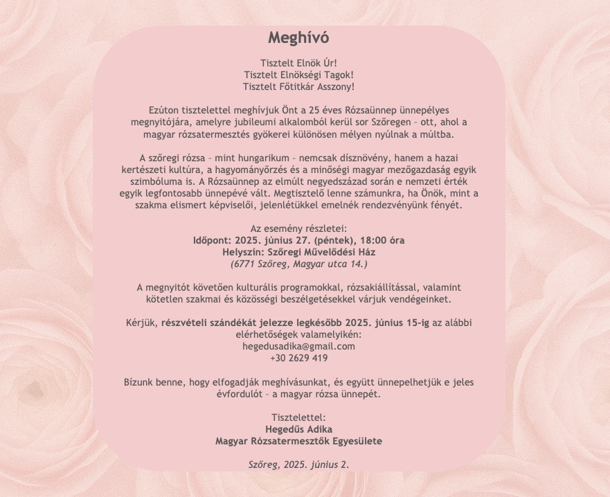 A szőregi rózsa – mint hungarikum – nemcsak dísznövény, hanem a hazai kertészeti kultúra, a hagyományőrzés és a minőségi magyar mezőgazdaság egyik szimbóluma is. A Rózsaünnep az elmúlt negyedszázad során e nemzeti érték egyik legfontosabb ünnepévé vált. Megtisztelő lenne számunkra, ha Önök, mint a szakma elismert képviselői, jelenlétükkel emelnék rendezvényünk fényét.